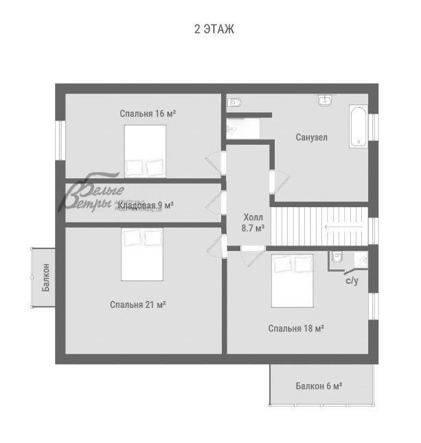 2-ой этаж: холл 9 кв.м, спальня 18.5 кв.м со своим санузлом и балконом 6.4 кв.м, кладовая 9 кв.м, спальня 15.6 кв.м, спальня 20.6 кв.м c балконом 2.6 кв.м, общий санузел на этаже с ванной и душевой